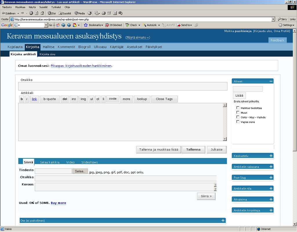 Postaukseksi kutsutaan siis tällaista uutta jutunpätkää tällä sivulla. Jokaisella yhdistyksen jäsenellä on oikeus tehdä omia postauksia, mutta kirjoituksia pystyvät kommentoimaan myös ulkopuoliset ei-jäsenet. Tekstien poisto- ja sivuston muut hallintaoikeudet on asukasyhdistyksen hallituksen jäsenillä. Kaikki postaukset ja kommentit julkaistaan automaattisesti heti. Ylläpidolla on oikeus poistaa epäasialliset kirjoitukset jälkeenpäin.
