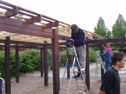 Iso pergola ja muutakin maalattiin talkoilla Jussilanpihassa » Pergolaa maalataan