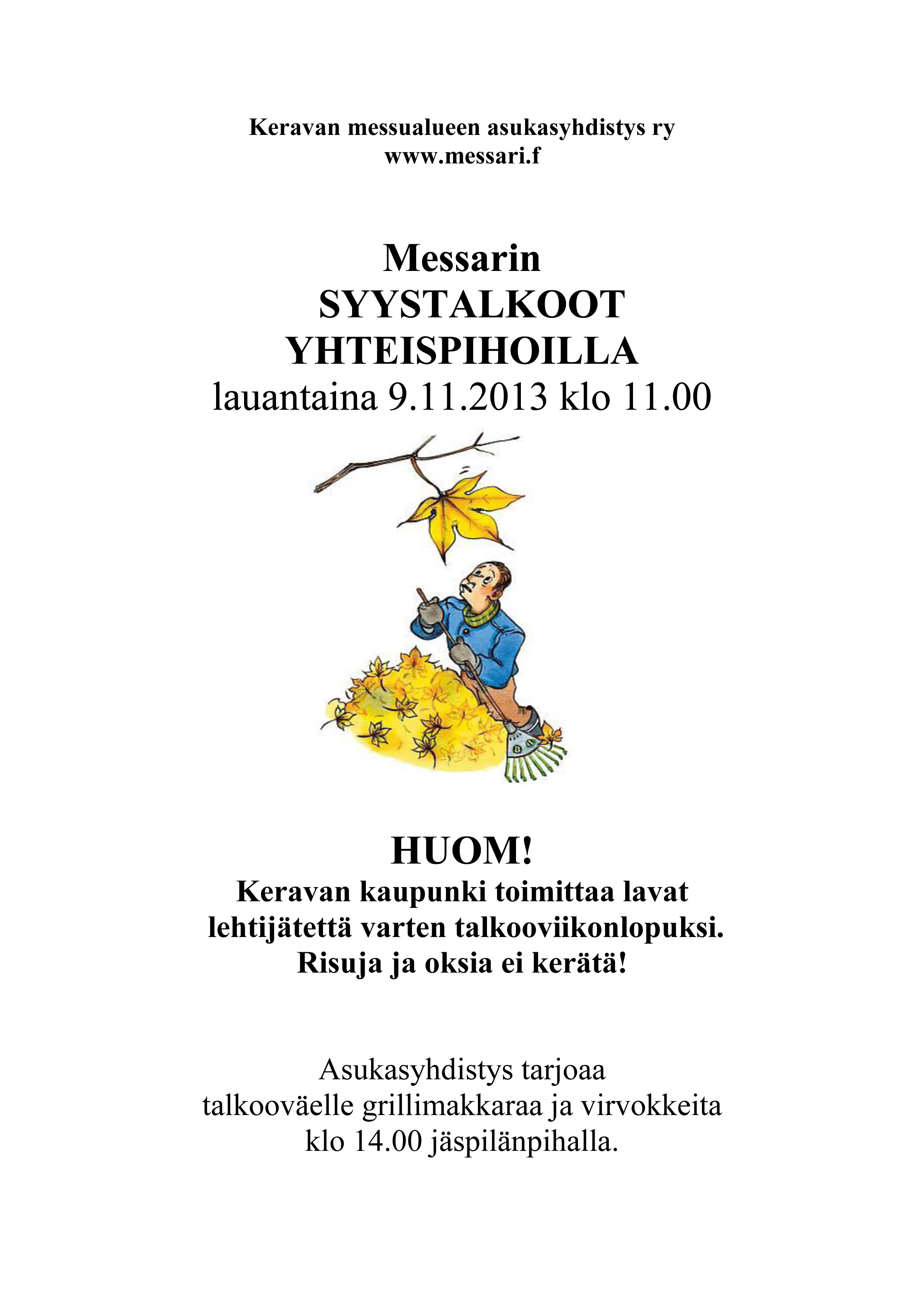 -Valitaan yhdistyksen uusi puistoryhmä. Jokaiselta pihalta vähintään 1 henkilö, joka toimii yhteyshenkilönä.